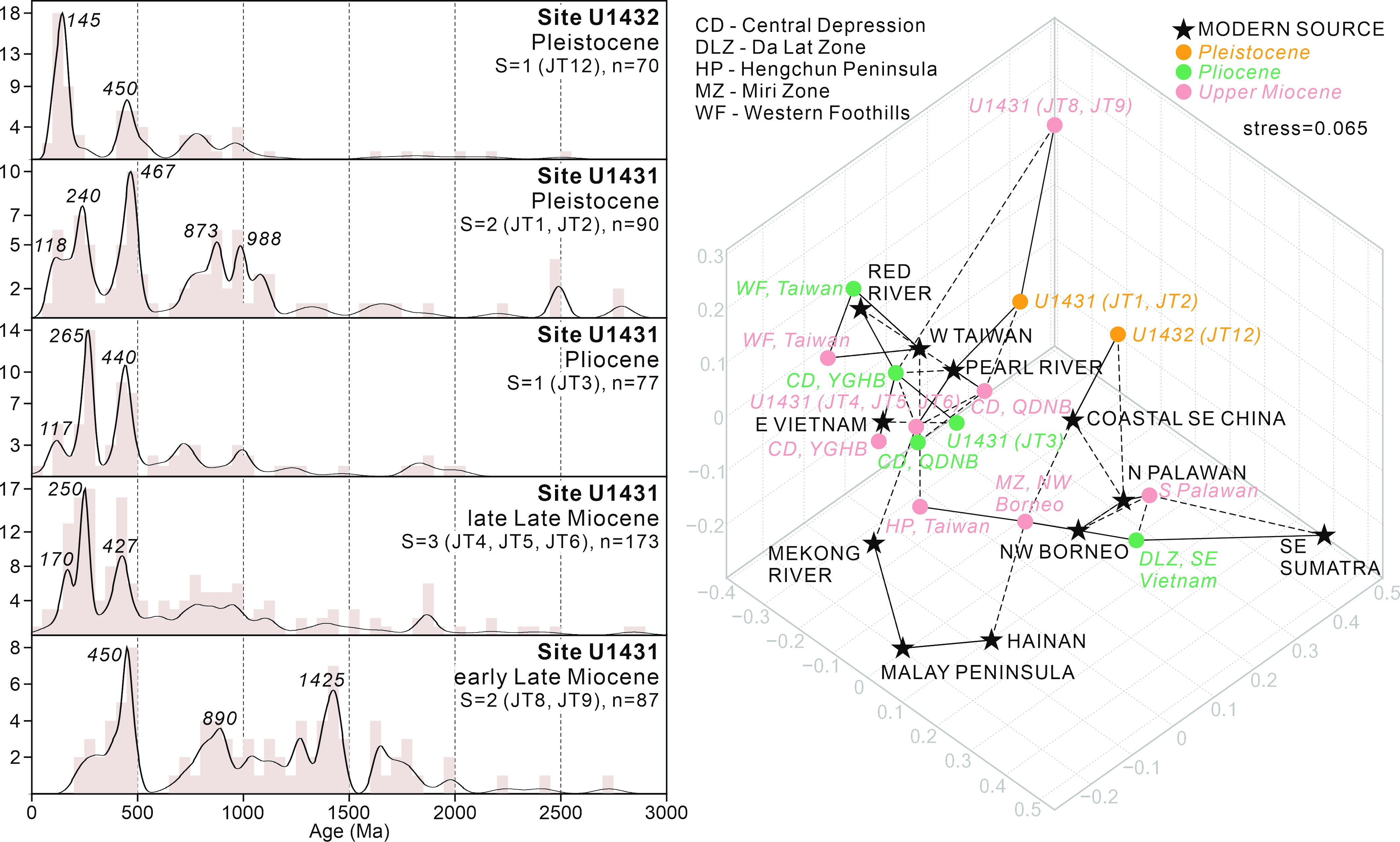 图2 U1431和U1432站位晚中新世-更新世沉积物碎屑锆石U-Pb年龄信号对比 |