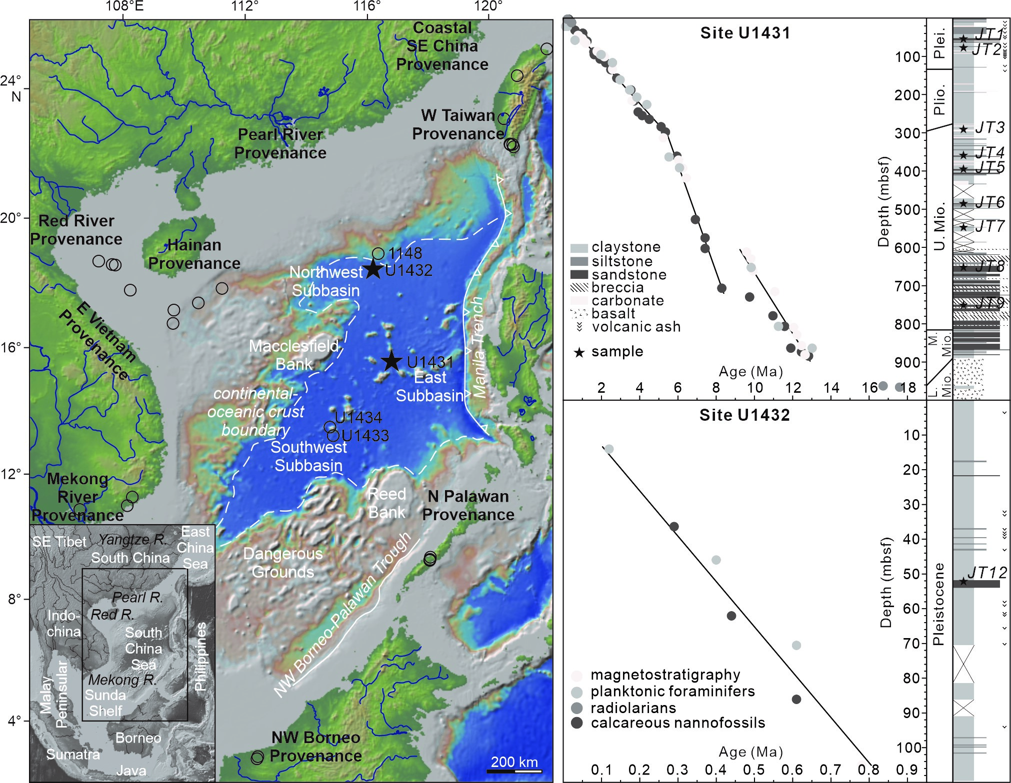 图1 南海及周缘地区地形图;IODP349航次U1431和U1432站位岩性柱状图及样品