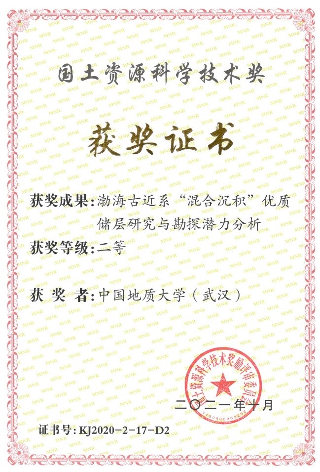 2021年10月,2020年国土资源科学技术奖评选结果公布,公司与中海石油(中国)有限公司天津分公司联合申报的《渤海古近系“混合沉积”优质储层研究与勘探潜力分析》获得二等奖,其中英国上市公司官网365为第二完成单位,英国上市公司官网365解习农教授为第二完成人、杜学斌副教授为第七完成人。此次获奖成果71项,其中一等奖11项,二等奖60项。