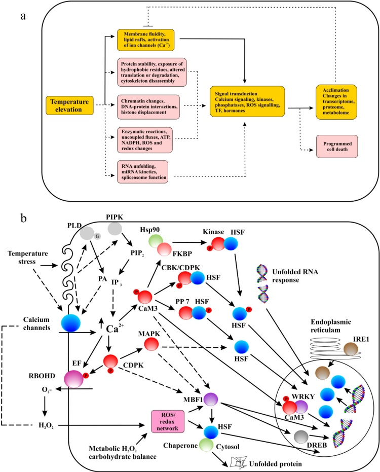 图3藻类温度温度感应模式图。(a)温度变化影响藻类的不同代谢过程,(b)藻类在应对温度压力时激活的信号转导途径。