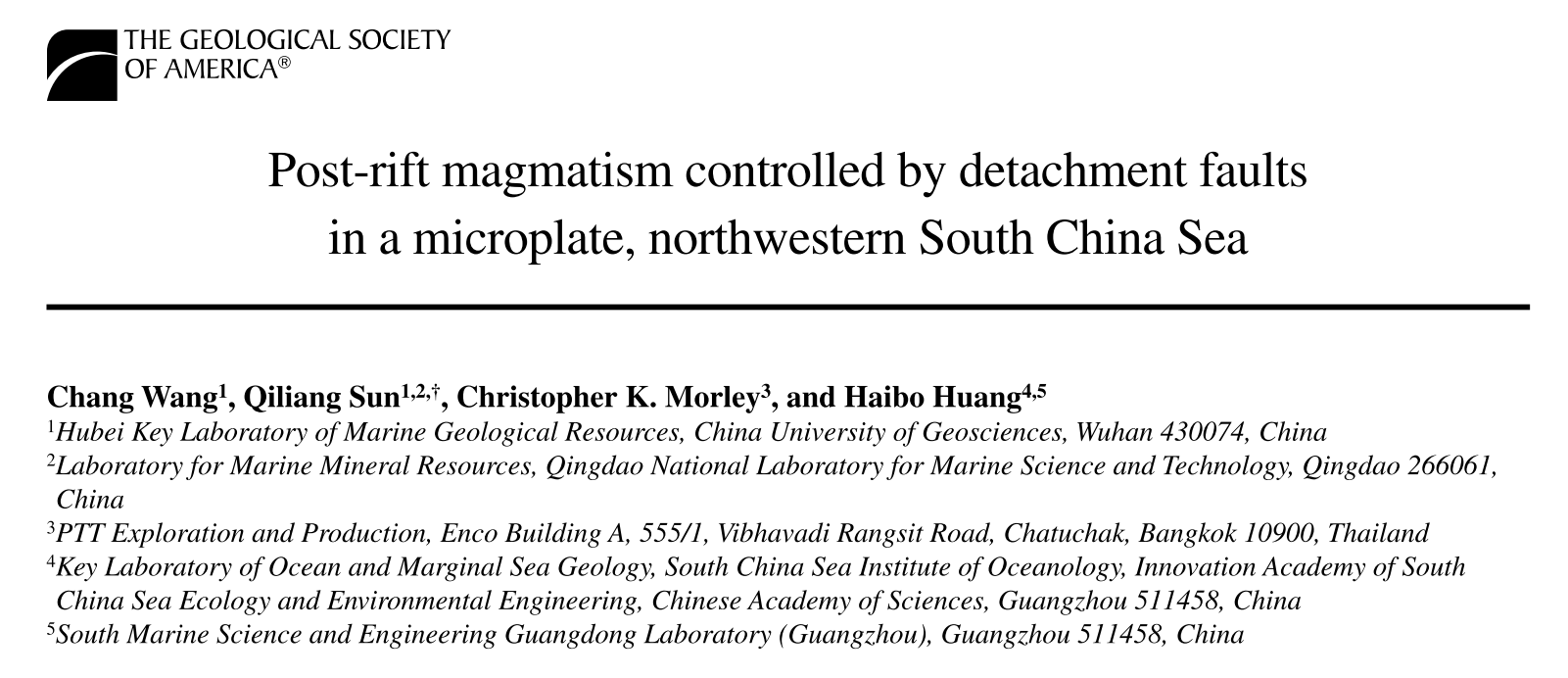 Wang, C., Sun, Q., Morley, C. K., and Huang, H., 2023, Post-rift magmatism controlled by detachment faults in a microplate, northwestern South China Sea: Geological Society of America Bulletin, https://doi.org/10.1130/B36981.1