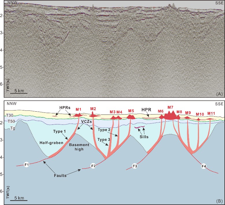 本研究揭示了西沙隆起裂后岩浆活动的运移机制。延伸至中地壳的拆离断层捕获了部分熔融产生的岩浆,并为其在地壳内的垂向运移提供了通道。进入沉积层后,拆离断层仍然是岩浆的主要运移通道;在沉积层间的刚性差异和区域应力场的影响下,岩浆在半地堑的侧翼和沉积中心开辟了次级运移通道。因此,较大规模的火山出现在基底高地上方,而小规模火山位于半地堑内部。这项研究强调了拆离断层对火山系统的关键作用,即在非均质地壳的背景下,拆离断层为相对刚性的微板块提供了岩浆运移通道,并影响了火山的分布。同时,该研究促进了对裂后岩浆活动和大陆边缘动力学演化的认识,并可应用于其他地质背景相似的区域。此外,本研究为不同成因的海底丘状体(Mound structure)提供了识别标准,适用于研究区以外的地区。