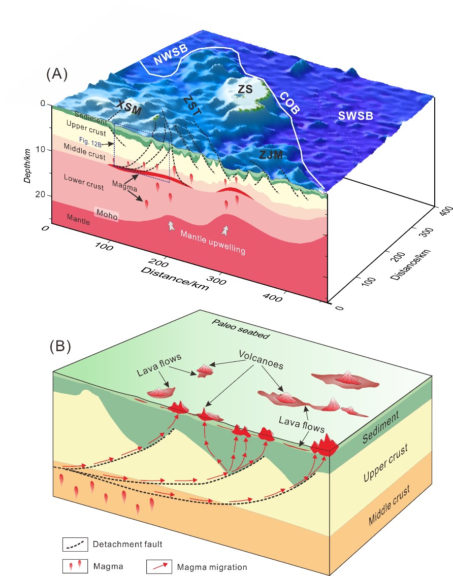 西沙隆起是南海西北陆缘的微板块之一,地壳厚度约20km,本研究利用二维多道地震数据,在西沙地块东南部识别出20个5.5 Ma以来的火山及其下部的岩浆运移通道。这些通道均发育自半地堑底部,而这些半地嵌由一系列ENE-WSW向或E-W向的拆离断层控制,这些拆离断层可能与岩浆通道存在密切联系。此外,海底地震仪(OBS)数据显示,这些拆离断层延伸至中地壳;同时研究区内存在下地壳高速异常(HVL)和中地壳低剪切波速层(LVL),这表明西沙隆起之下存在岩浆底侵和部分熔融,岩浆来源可能来自海南地幔柱。