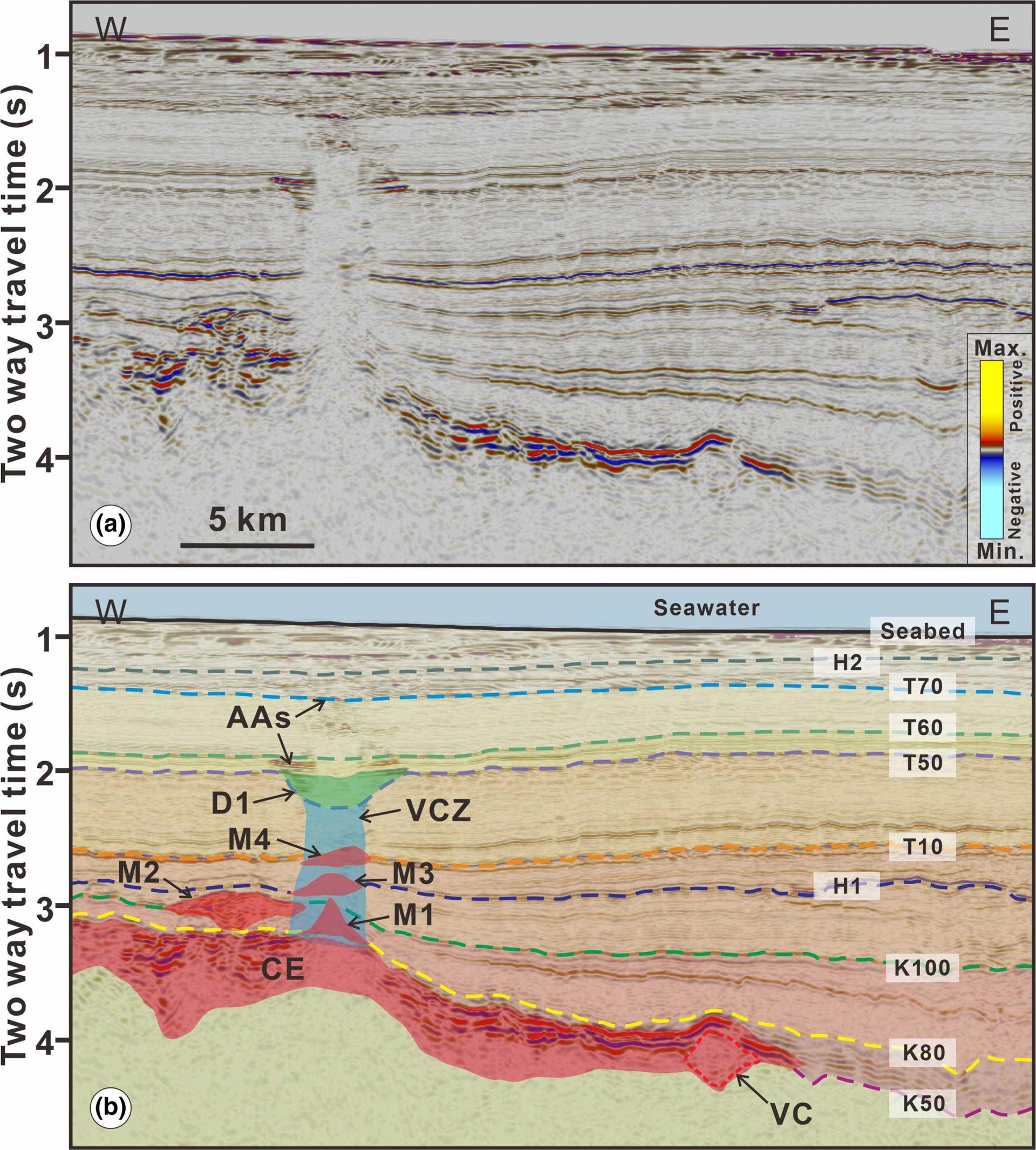 图2 火山区、热液喷口、麻坑与流体地震剖面图(a)及解释(b)