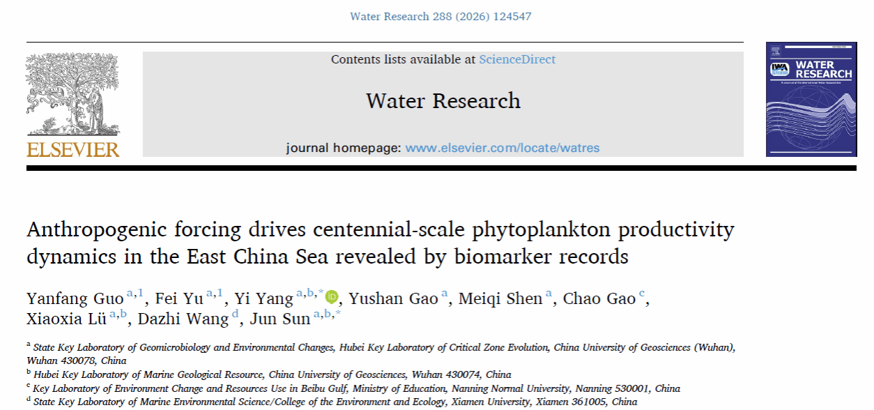 近日,环境科学Nature Index期刊《Water Research》刊发杨义副教授研究生郭艳芳(已毕业)和博士生余飞作为共同第一作者的学术论文—Anthropogenic forcing drives centennial-scale phytoplankton productivity dynamics in the East China Sea revealed by biomarker records(生物标志物记录揭示了人类活动强迫驱动东海百年尺度浮游植物生产力动态变化)。该成果是公司杨义副教授联合孙军教授团队和厦门大学王大志教授团队共同完成。通讯作者为杨义副教授和孙军教授。