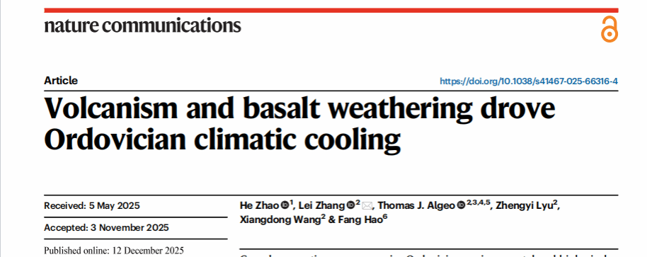 论文信息如下:Zhao He , Zhang Lei, Algeo J. Thomas, Lyu Zhengyi , Wang Xiangdong , Hao Fang . Volcanism and basalt weathering drove Ordovician climatic cooling. Nature Communications 16, 11475 (2025). https://doi.org/10.1038/s41467-025-66316-4