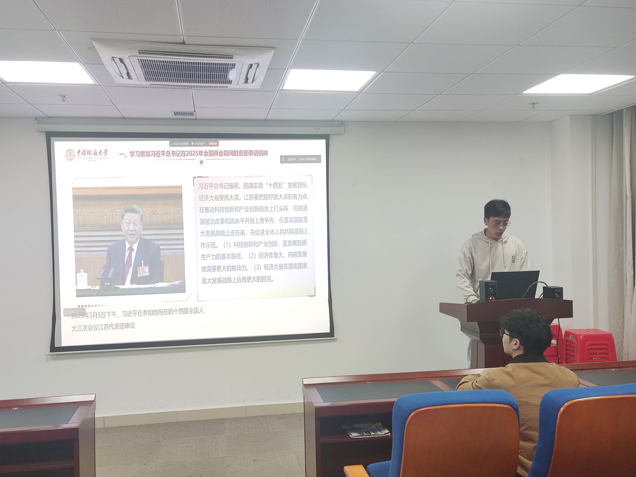 支部党员唐文森同志在活动中带领支部成员深入学习习近平总书记在全国两会期间的重要讲话精神和2025年全国两会精神。党员们认真学习政府工作报告,深刻领会其中蕴含的丰富内涵和重大意义。