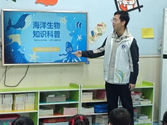 活动中,主讲人汤天驰以提问的形式开场,瞬间点燃了孩子们的热情。随后,他从海洋生物的分类、特征和分布三个方面进行讲解,让大家对海洋生物有了进一步的认识。在互动环节,他为同学们科普了海洋保护的重要性及措施,大家也积极踊跃地分享了自己对海洋保护的想法,获得了小奖励。期间,志愿者还分享了趣味海洋知识并播放了《章鱼的保护术》视频,同学们看得聚精会神,惊叹连连。