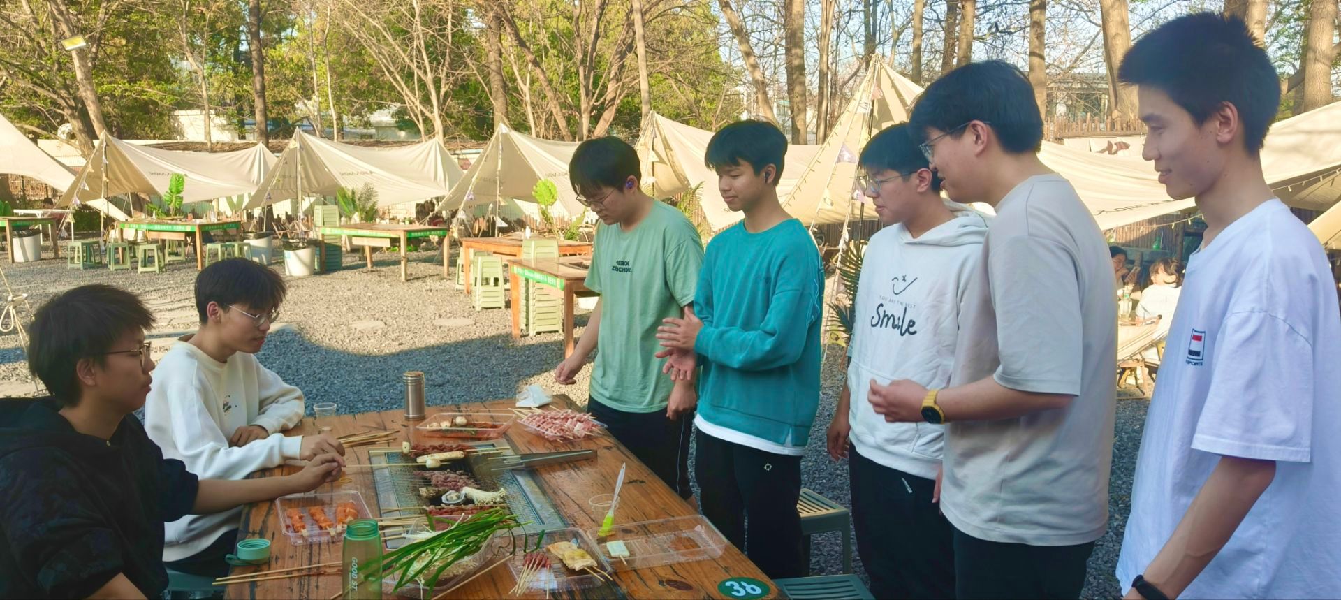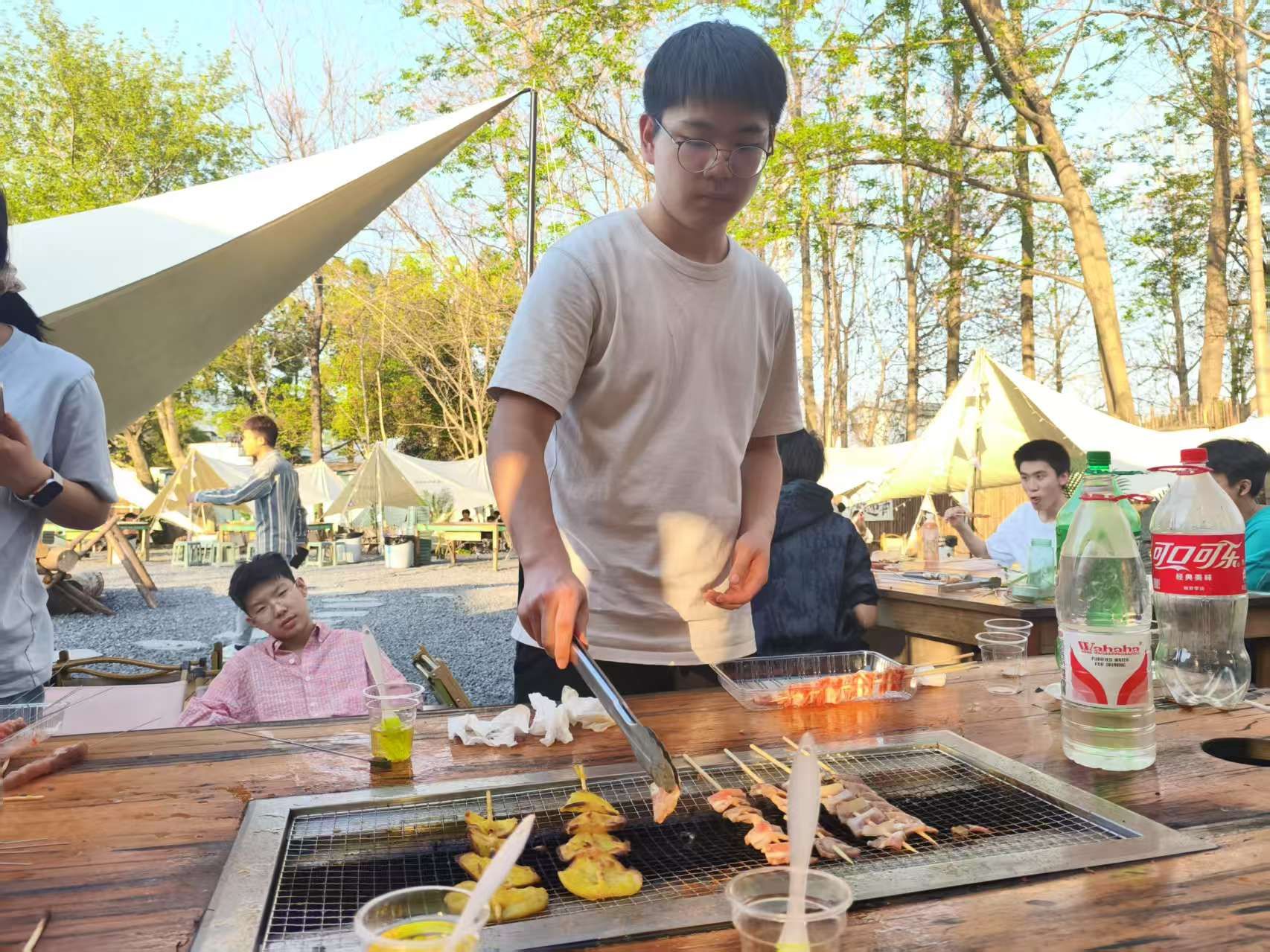 同学们分组协作,或娴熟翻烤食材,或虚心请教技巧。滋滋作响的五花肉、金黄酥脆的鸡翅、清香扑鼻的蔬菜,不仅满足味蕾,更成为分享生活趣事的契机。袅袅烟火中,学业压力与社交焦虑悄然释放,真挚情谊随春风流转。本次活动以轻松愉悦的形式,有效缓解了春季情绪波动与人际焦虑,增进了同学间的理解与信任。游戏与美食交织的春日记忆,为24H243班的集体成长注入了温暖底色。