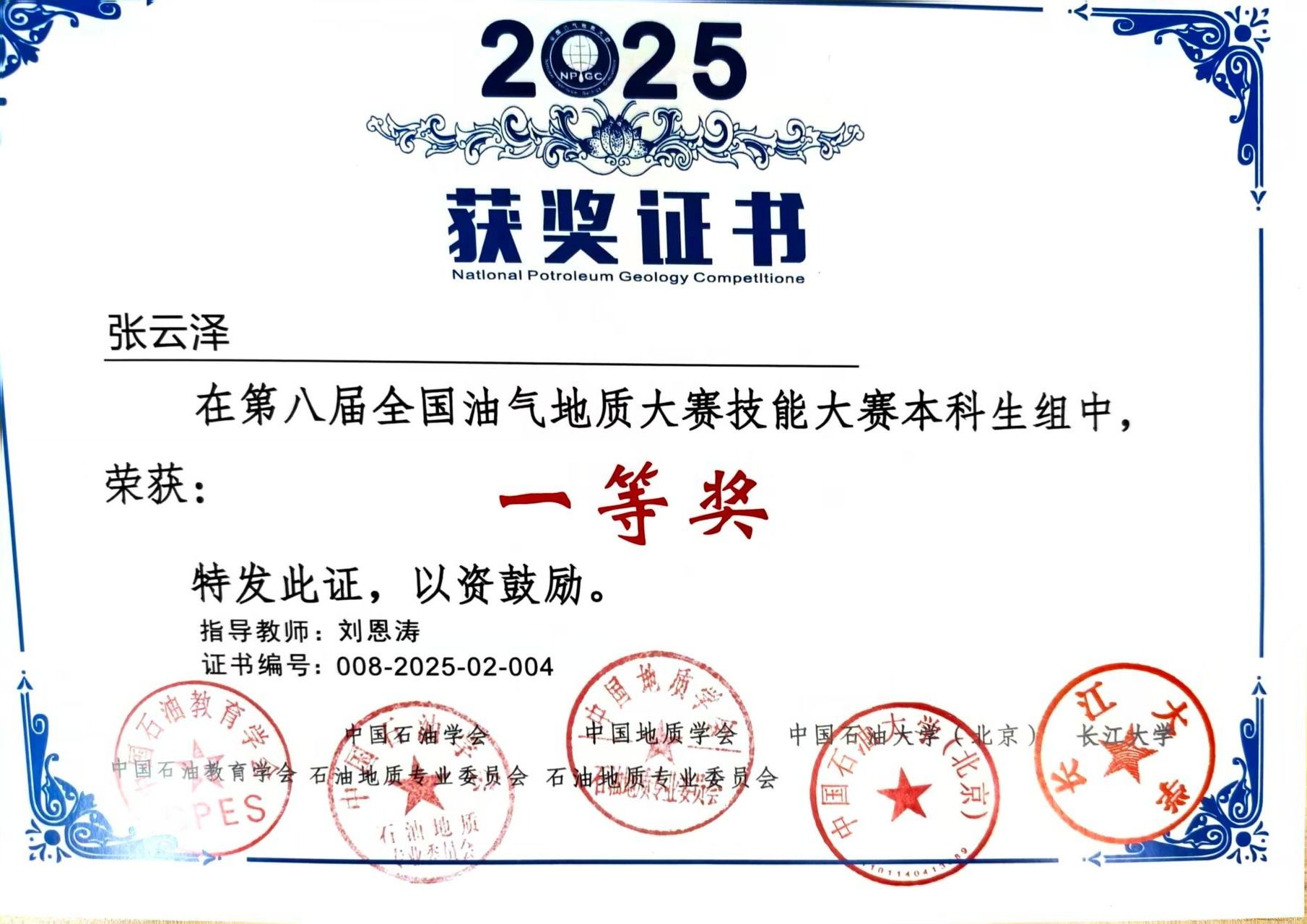 在科研领域,张云泽从不甘落后。他作为主要成员参与两项国家级老员工创新创业训练计划项目并成功结题,将课堂所学转化为实践成果;竞赛中,他斩获全国油气地质大赛一等奖、全国智慧海洋大数据应用创新大赛优胜奖等荣誉,用实力证明了科研能力。这些探索不仅提升了他的专业素养,更培养了他团队协作与解决问题的能力。