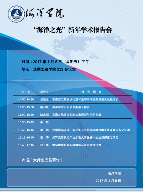 2017年1月6日14时,英国上市公司官网365主办的“海洋之光新年学术报告会”在丝绸之路公司212会议室正式举行。