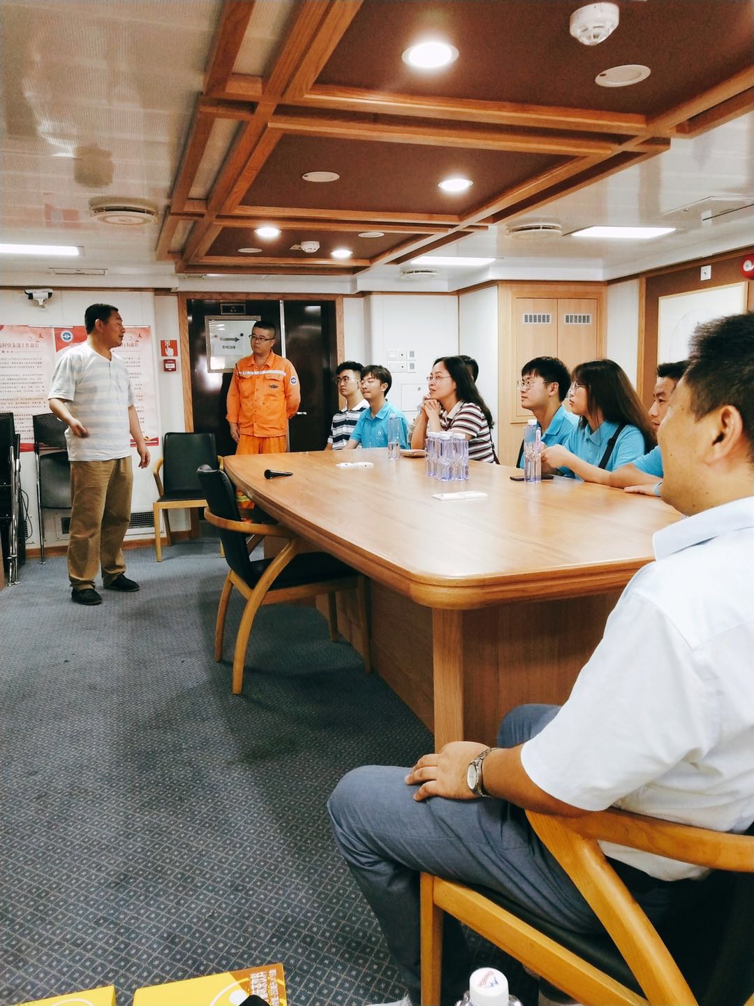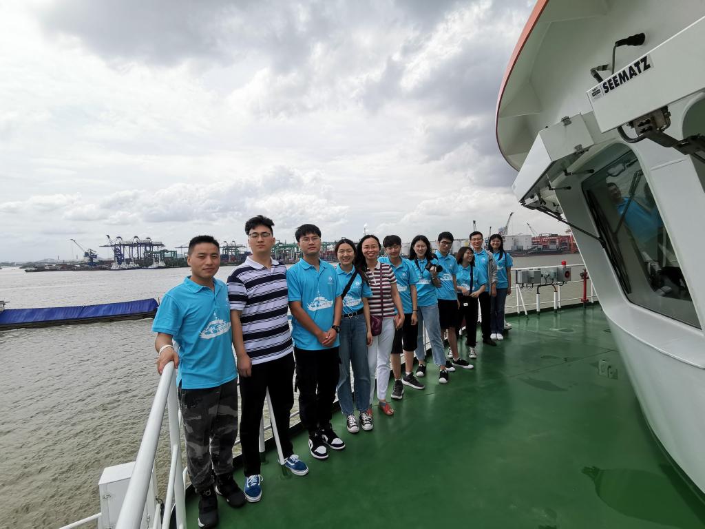 在殷机长和胡船长的带领下,队员们第一次登上科考船,第一次见船载钻探系统,第一次进入科考船的轮机室,第一次在船上餐厅吃饭……实践团队员们体验了海洋人真实的一天生活。在与殷机长的座谈中,队员们了解到,1984年我国拥有的第一艘地质调查船——探宝号,是一艘在美国已经服役15年淘汰的科考船,载重1200吨,可是在当时,探宝号已经是国内最先进的科考船。30多年来,我国海洋事业不断发展,我国如今已经自主研发设计了可集海洋地质,地球物理,物理海洋,海洋生物,海底钻探,水文调查等多手段综合调查,先进的深海浅层钻探系统以及可视化取样等设备,形成底层水体,海底表面,以及海底浅层的立体综合探测体系。从进口发达国家废弃旧船,到自主研发的海洋十号,再到即将建成的为建党100周年献礼的近4万吨水合物开采船,队员们看到了几代海洋人为我国海洋事业做出的巨大贡献,看到了改革开放以来我国的海洋建设事业迅速的发展和进步。