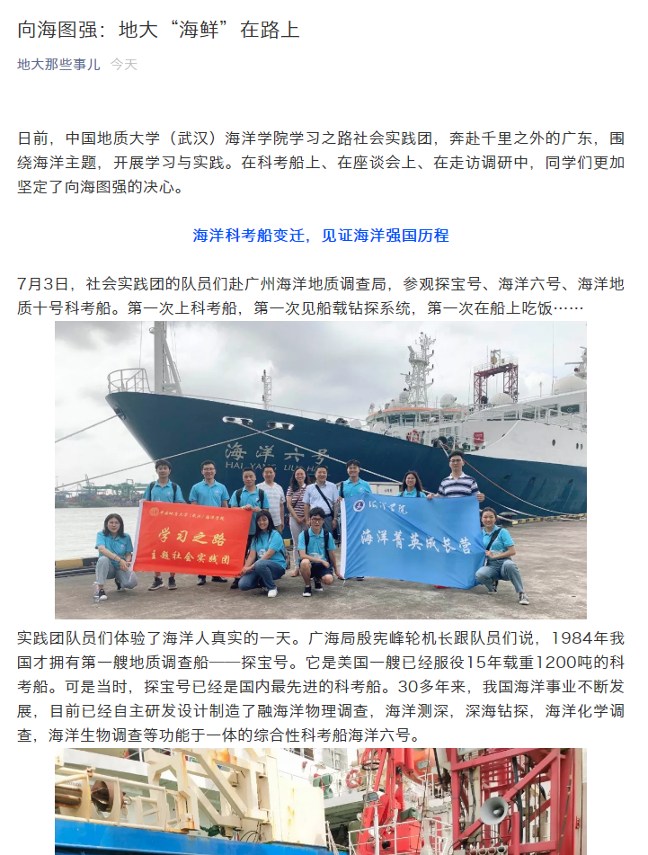 地大党委宣传部官方公众号“地大那些事儿”长篇幅报道公司暑期社会实践。