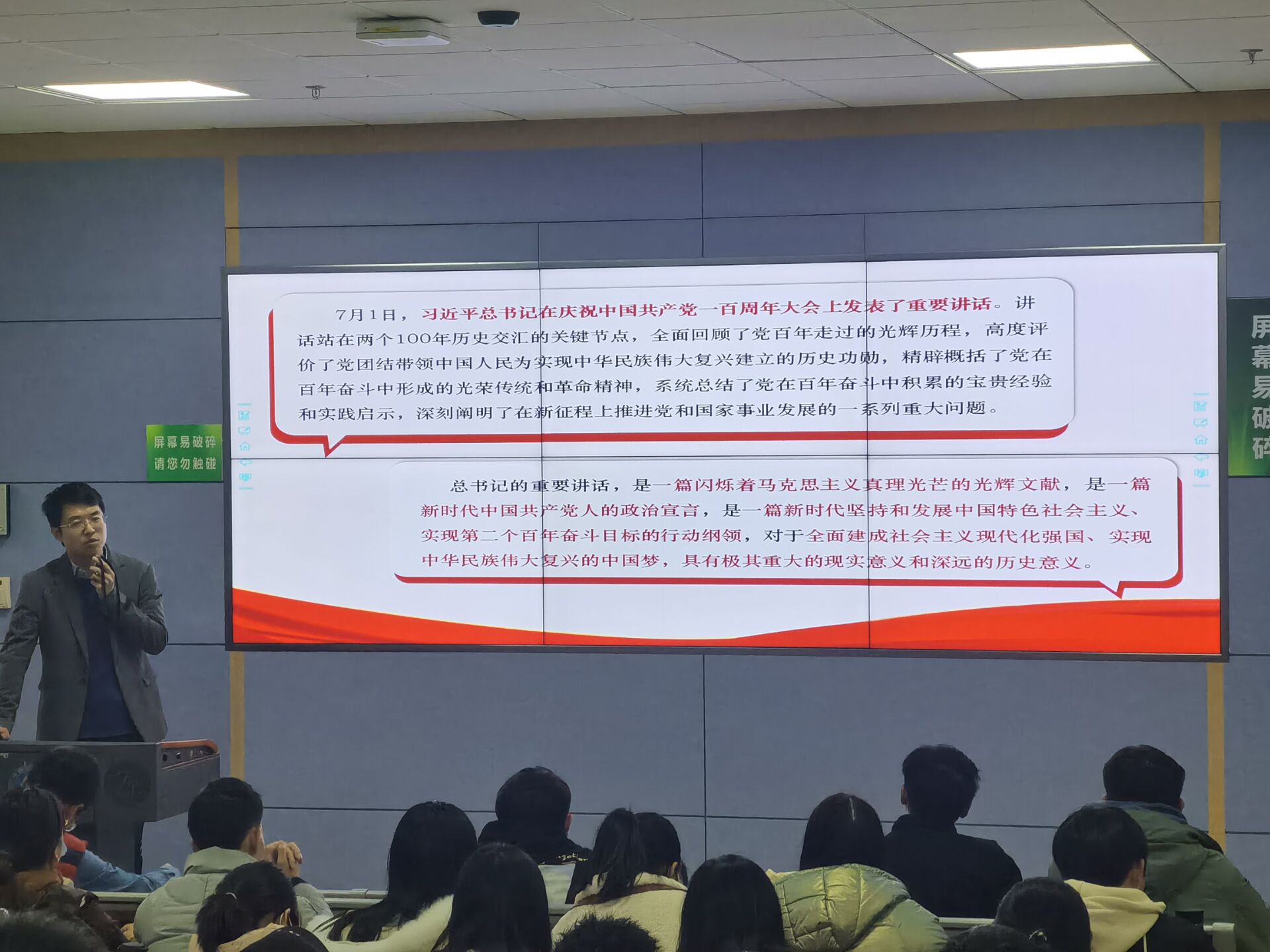 资源公司辅导员霍少孟从“重要讲话的历史背景和重大意义”、“重要讲话的整体框架和主要内容”、“争做担当民族复兴大任的地大新青年”三个方面,深入阐释七一讲话精神和青年的使命担当。帮助同学们科学正确地认识七一讲话的意义与精神、明确青年人的使命担当、以及坚定投身报国伟业的信念。