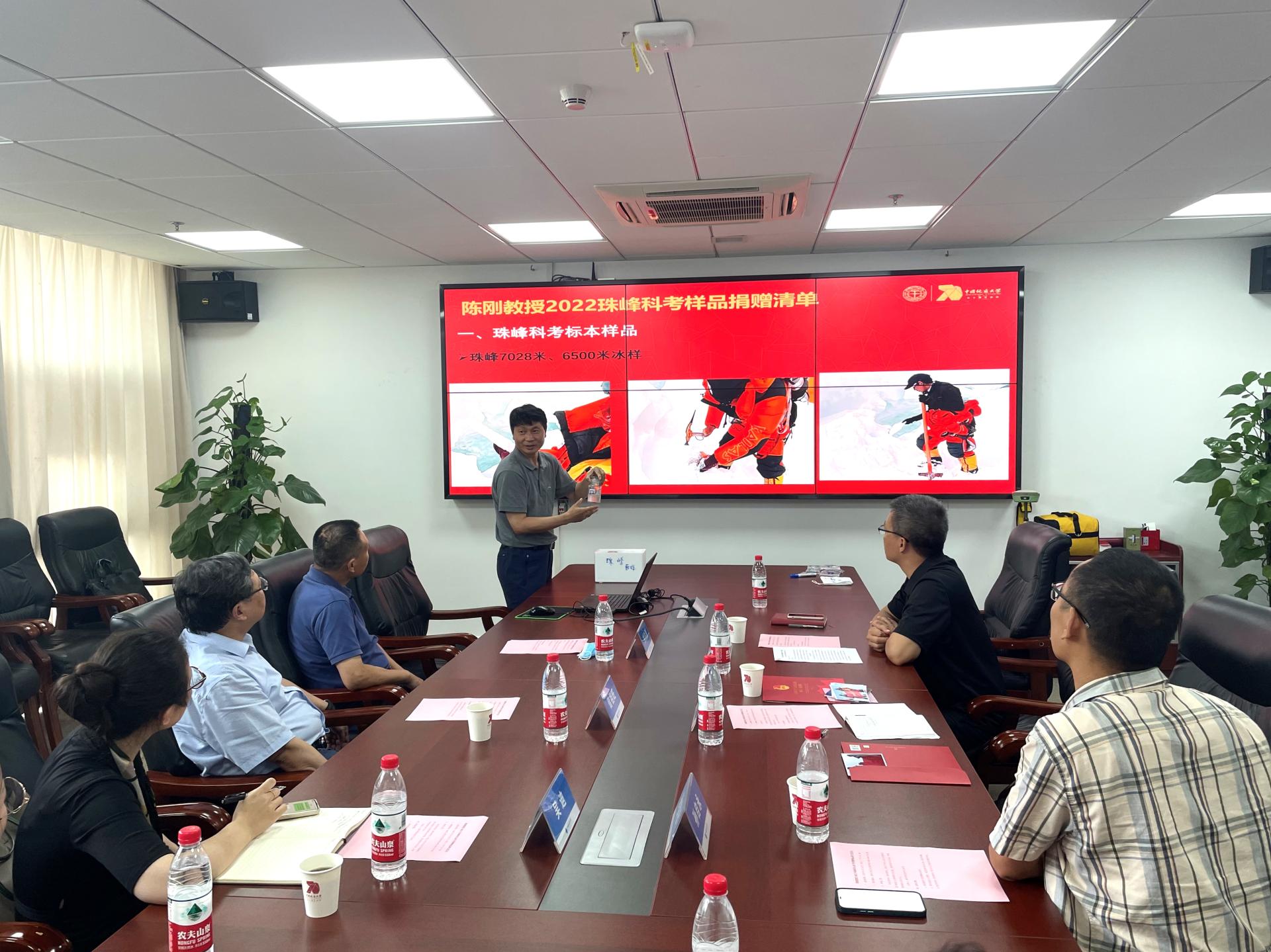 公司党委书记成军主持仪式。他介绍,今年公司陈刚教授成功登顶8848.86米的珠穆朗玛峰,圆梦世界之巅。陈刚教授心系公司,将公司标识高举在珠峰顶峰,并带回大量了标本样品,整理了大量影像材料,选择捐赠给公司,为公司70周年校庆献礼。
