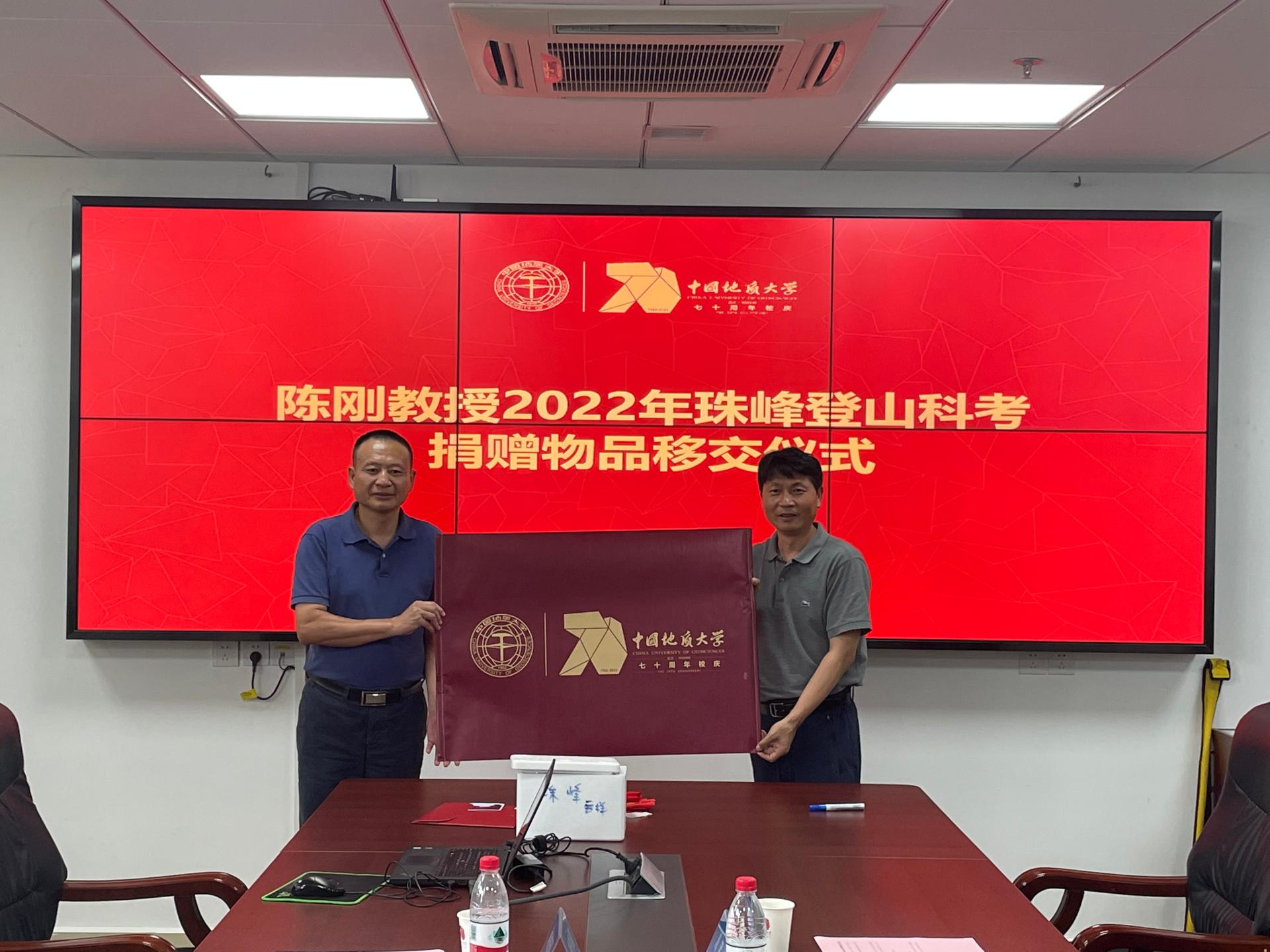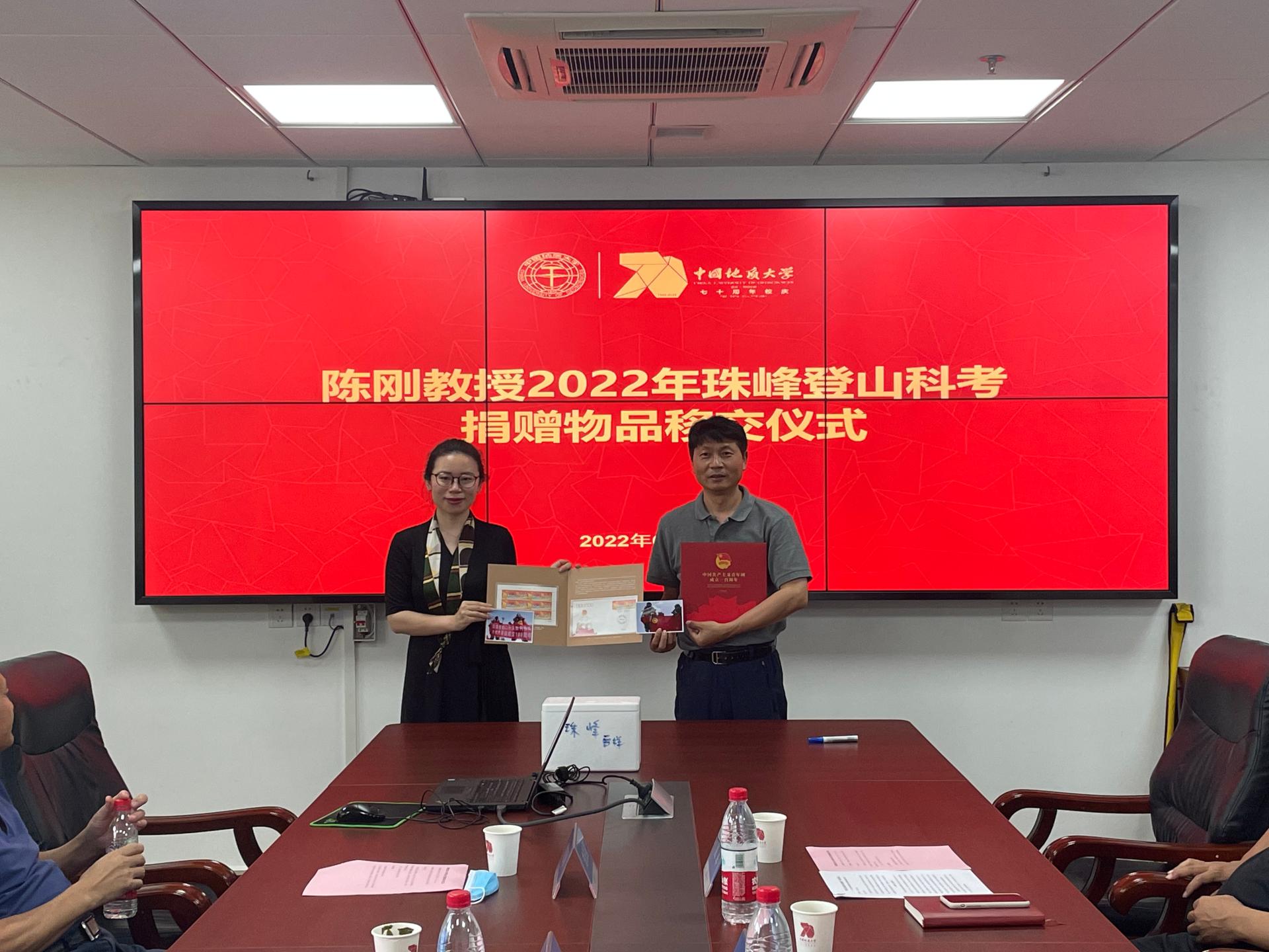 图书档案与文博部部长刘先国,校团委副书记吴迪,环境公司副经理孙自永代表各单位接收陈刚教授珠峰登山科考捐赠物品。