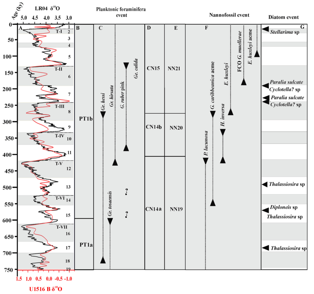 论文中同位素地层年代以及基于浮游有孔虫、钙质超微化石和硅藻的海洋地质年代框架