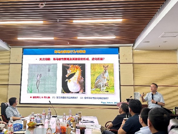中国科公司南海海洋研究所林强研究员应邀作《印-太海龙科鱼类适应辐射与性状演化》报告。林强研究员从生命起源引入他的报告,表明了印-太海域是全球海洋生物多样性中心、但不一定是种化中心的观点,提出了海洋物种多样性形成机制、扩散与适应辐射模式等问题。随后,林强研究员以海龙科鱼类为例,讲述了其多样性的形成、演化和遗传机理,分别从印-太海域向西到印度洋海域,向南到南澳海域,向北到中国沿海区域进行了海龙科生物的外形和生态适应性的讲解,同时分析了海龙科鱼类伴随生态位分化产生的本地适应性。