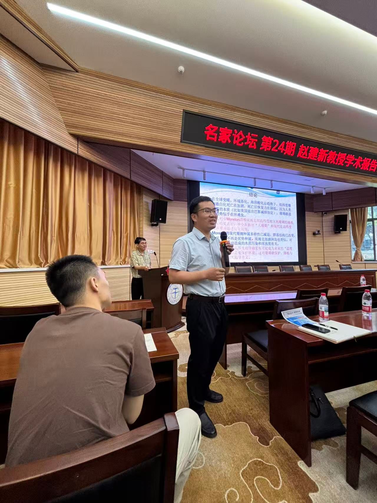 赵建新教授的报告内容深入浅出、案例生动,激发了在场师生对珊瑚礁研究的浓厚兴趣。参会师生在问答环节踊跃提问,围绕样品采集与处理方法、珊瑚白化与温度因子的关联机制、高低纬度珊瑚礁生存环境差异等议题,同赵建新教授展开了热烈而深入的交流。整场报告会气氛热烈,赵教授专业而细致的解答赢得师生们阵阵掌声。