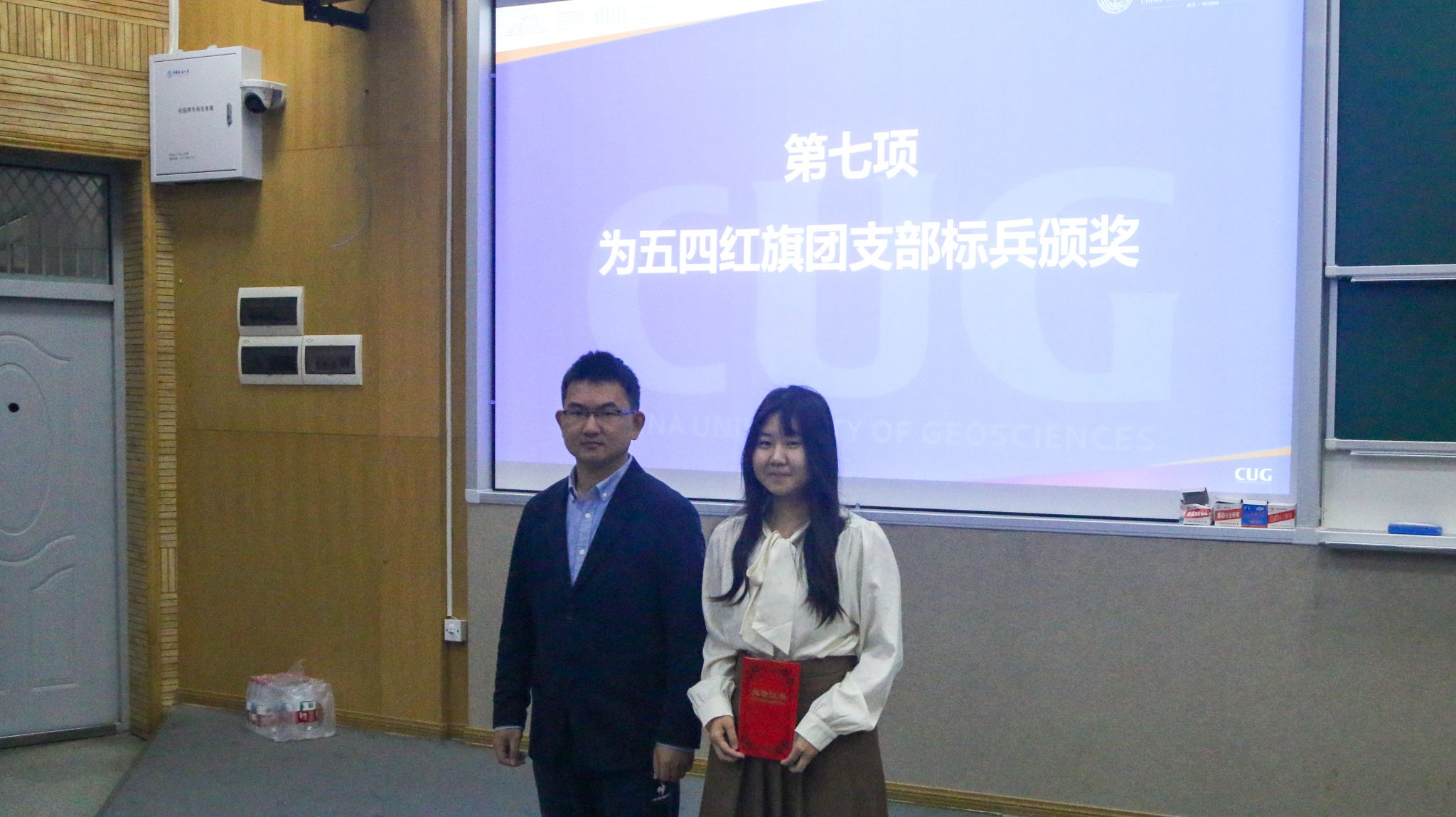 涂海文老师为五四红旗团支部标兵颁奖。