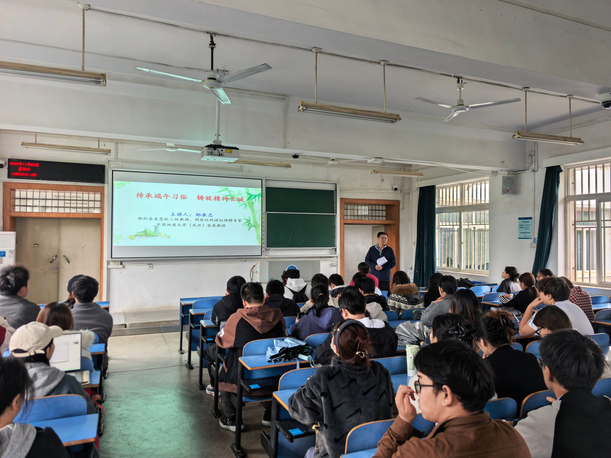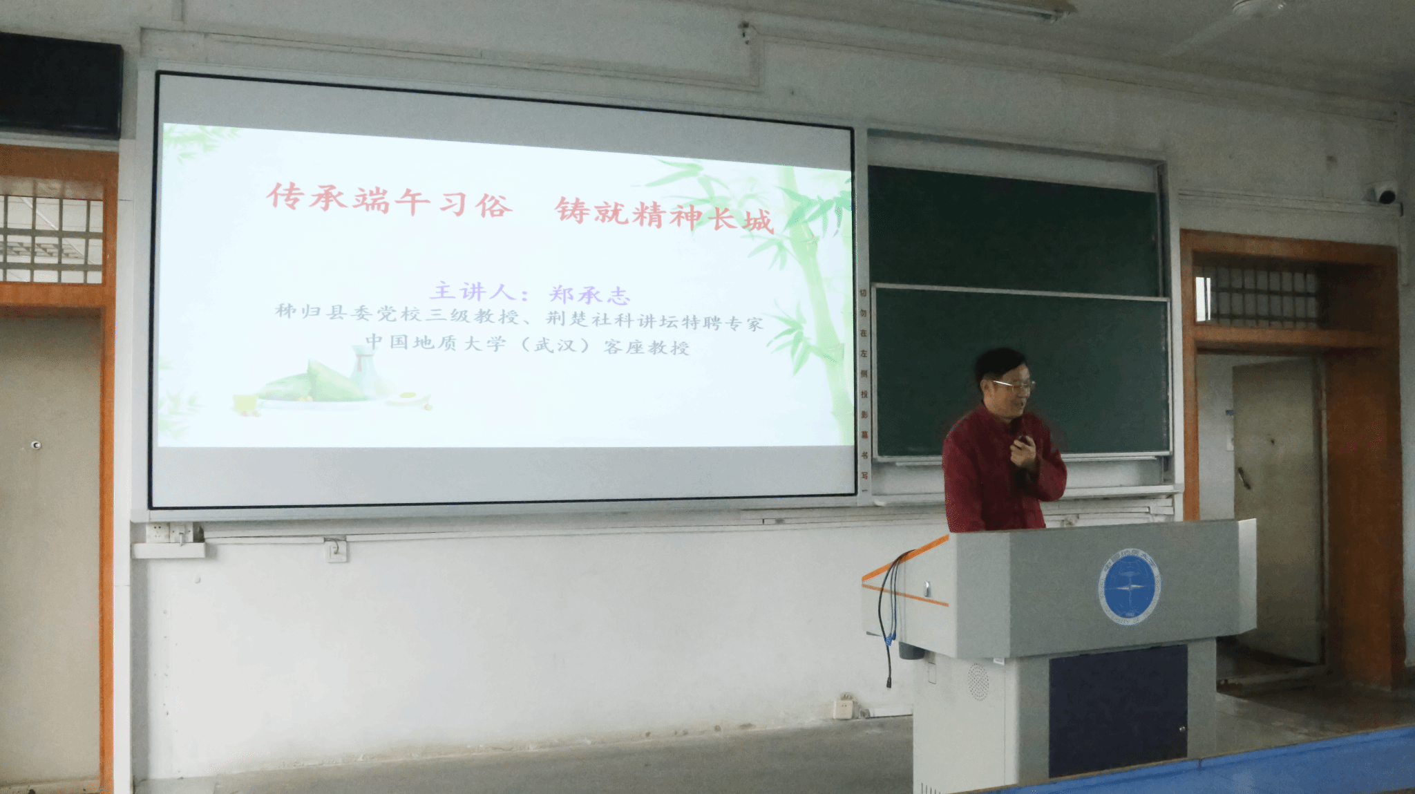 讲座中,郑承志教授从端午节的多元起源切入,系统阐述了其融合原始信仰、生存智慧与爱国精神的历史脉络。他详细分析了端午节从“趋利避害”的民间习俗到承载屈原等历史人物精神内核的升华过程,厘清了公众对端午起源的常见认知误区。